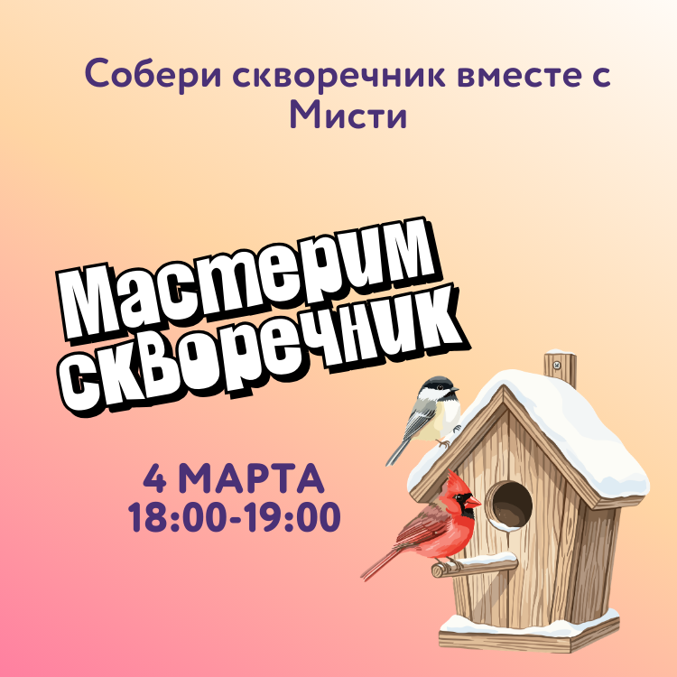 Встречаем весну и готовимся к прилёту пернатых друзей! Вместе с любимым героем создаём собственный скворечник и наполняем день теплом, творчеством и хорошим настроением.